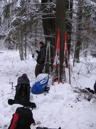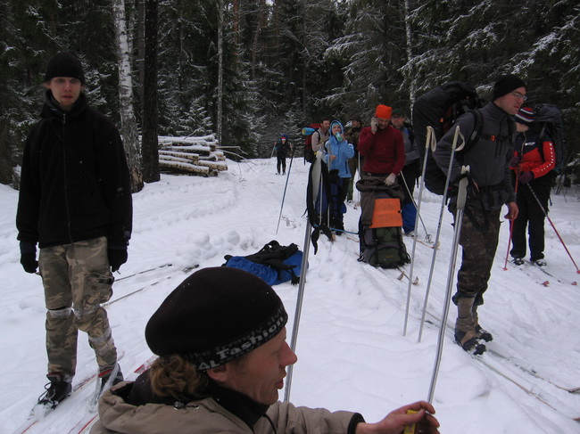 Одели и лыжи. В плане этих самых лыжей группа была исключительно разномастная: у половины свои лыжи штатные, другая половина взяла кто где - беговые и не беговые, деревянные, фанерные и пластиковые. Некоторые из них выглядели не совсем убедительно. Часть группы с лыжами имела дело и вовсе впервые.