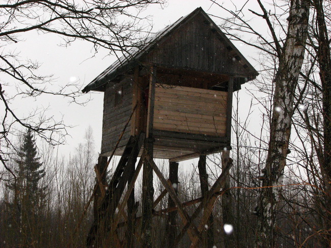 Встретили охотничью засидку – уютный крытый домик на сваях, обитый изнутри вагонкой с окном-стеклопакетом. Я здесь в нем прошлый раз и заночевал. Шли после напараво, то есть километр на запад, потом на юго запад, по просеке. Лес тут еще более болотный и еще более стал густой и инфернальный. Пока по снежной корочке проходится все это скоро и хорошо. Уже через какой месяц распутица и так, как сегодня, здесь, в этом лесу, уже не погуляешь. Будет каша и стоять вода.