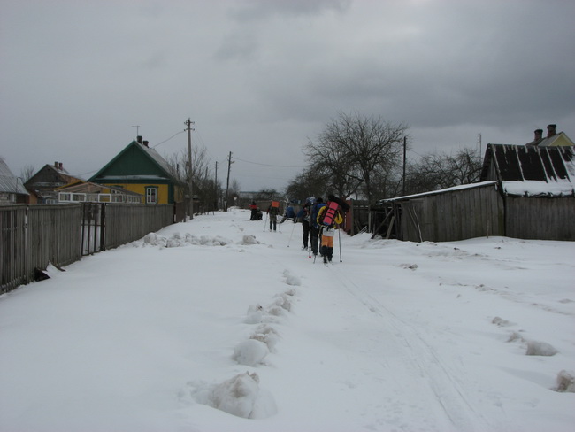 На железнодорожной станции взяли лыжи в руки и пошли строго перпендикулярно путям. Было темно и влажно. Лаяли собаки. Тотчас за плетнем крайнего огорода ноги стали утопать в достаточно глубокий снег.