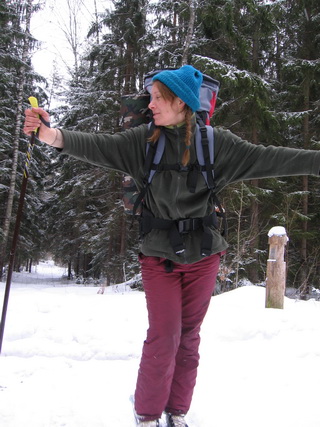 Трапезу и сборы закончили не ранее, чем в одиннадцать. Вышли удачно. Тотчас выяснилось, что импровизировать с переправой через реку Житинка нет необходимости, поскольку неожиданным образом она замерзла льдом. Мы быстро оказались на том берегу в сплошном ольховом лесу. Шли по вчерашнему сценарию. Глаз последний, или Максим последний. Лыжня вскоре вывела нас на просеку. Просека постепенно на извилистую леную дорогу. День был очень хорожий. Погожий и ясный, хоть даже и не сказать, что солнечный.