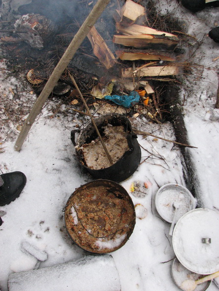 У нас вокруг костра был умеренный бардак. В меньшем котелке были остатки сногсшибательного плова - красного и по вкусу похожего на плов. В большой кастрюле хуже. Там образовалась подгоревшая подкладка. Она местами отстала от стенки. С пристеночной стороны была черной и обугленной, с внутренней же - белой клейкой рисовой кашей.