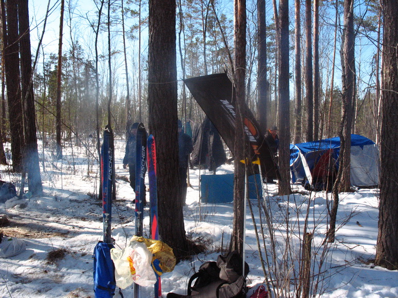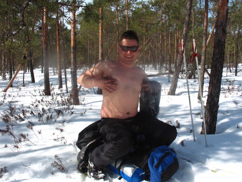 Ветра в сгустившемся лесу совсем не было. Ядерное солнце в дымке неплохо подогревало. Пахло слегка сосновой смолой. На привале появились любители обнажаться, особенно пузатый Сережа Волосач. Пузатым зимой вольготно. Их тяжело заморозить.