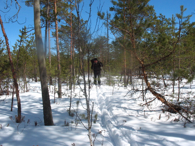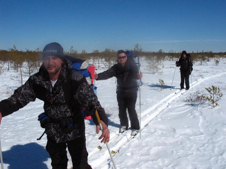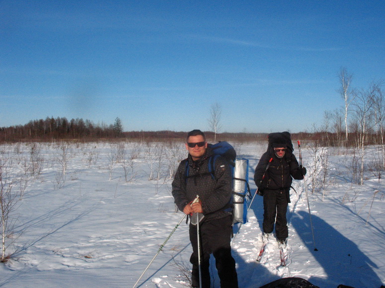Мы продолжали двигаться на запад с небольшой южной составляющей. Шли лесом, который вскоре поредел, расступился, сменившись болотом. Болото раскинулось на большую площадь. Среди его простора имелись отдельные островки высоких деревьев. Было оно в основном лысым и обильно засыпанным уветренным прочным снегом. Солнце светило и сегодня активно. В небе была легкая облачная риза, через которую солнце пробивает беспрепятственно. От нас, лыжников, отбрасывались на снег тени. Лица уже к тому времени ощутимо загорели, но пока еще не сгорели совсем. Небо бороздил большой пассажирский лайнер. Наверняка Боинг или Аэробус. Легкий ветер стал тонизирующе поддувать в спину.