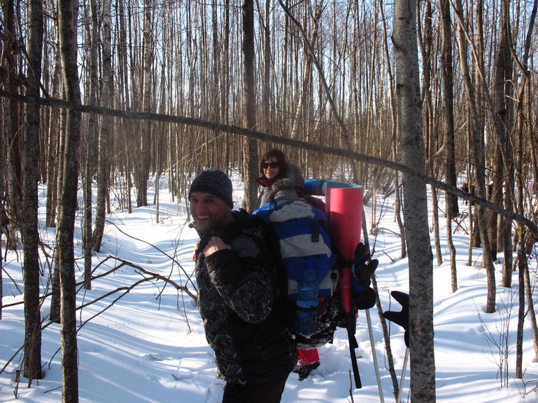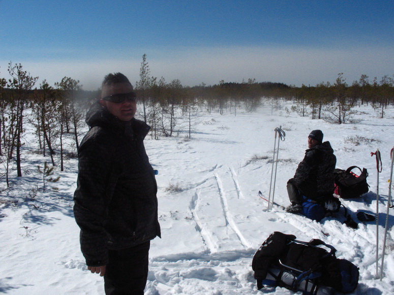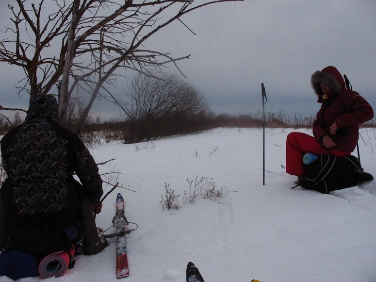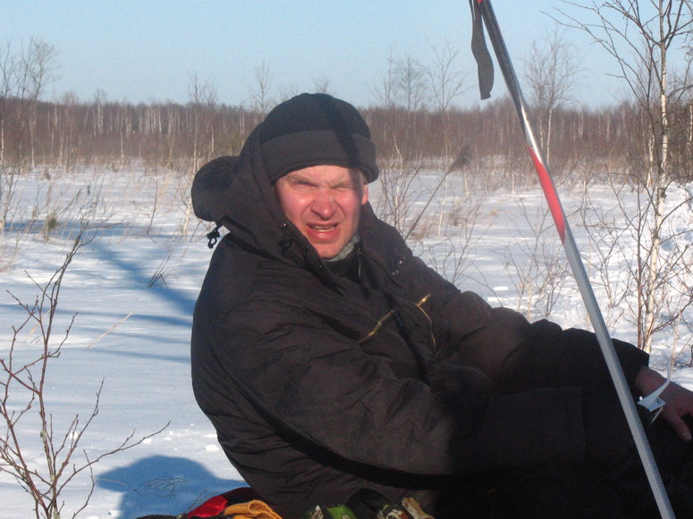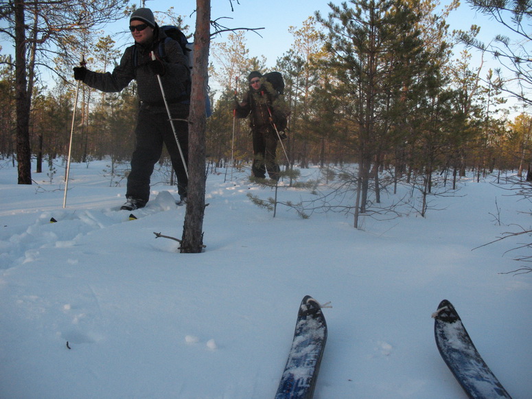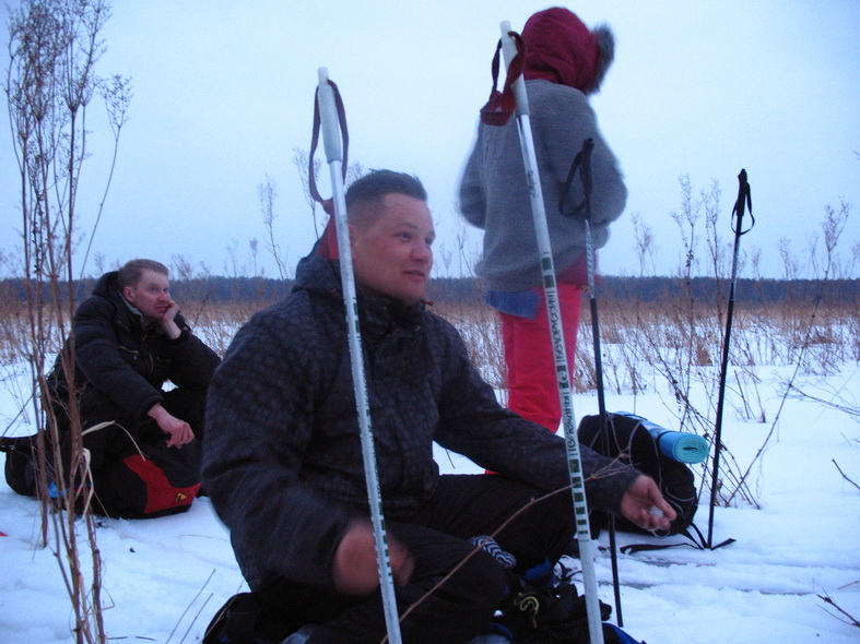 Разошлись в противоположных направлениях. Он, это, обратно, полуползком (снег был там весьма глубок). Я, на запад, пошел уже чрезмерно опираясь на палки.