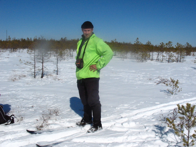 Лес наконец начал редеть. Мы вышли на голое клюквенное болото. Здесь были редки деревья, особенно живые. Торчали в основном из-под снега высохшие шесты. Было где разгуляться здесь ветру (но не сегодня). Он утрамбовал-отутюжил снег, что лыжи почти не проваливались. Прорезали его с шипением, образуя не глубокую лыжню. Шли дружно, не сильно растягиваясь. Глаз занимался популяризацией Андрея Русьянова: