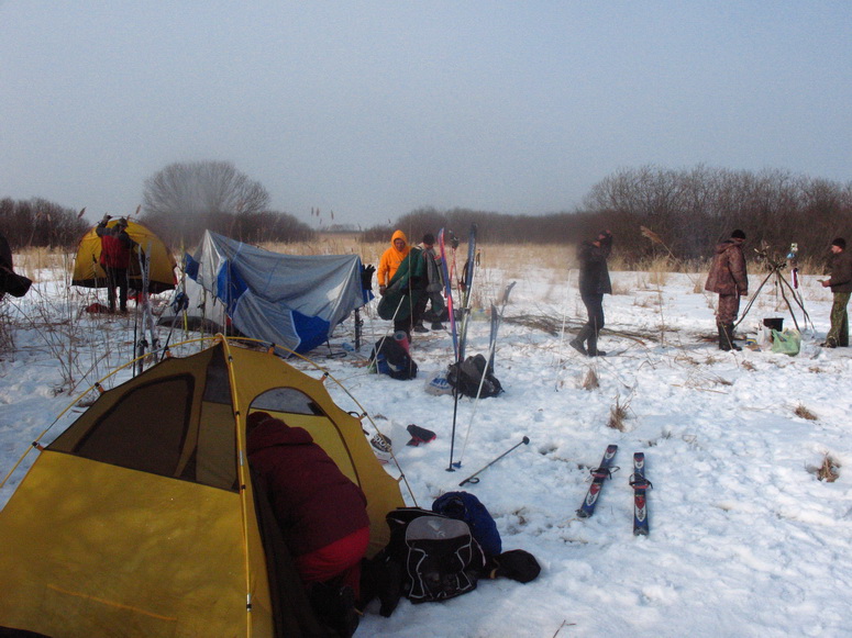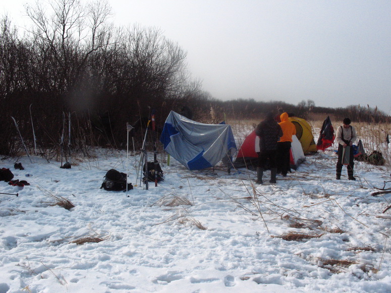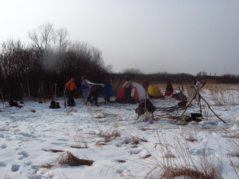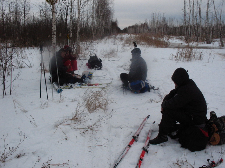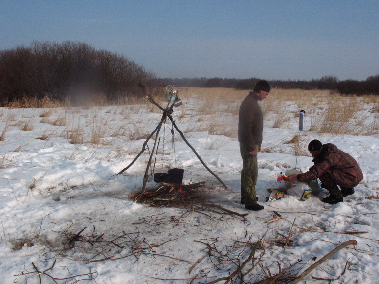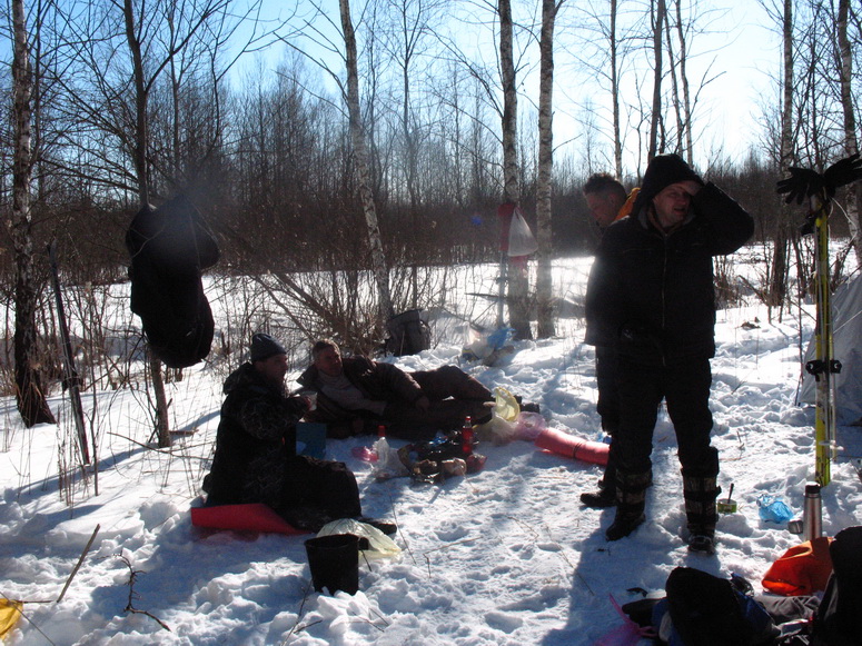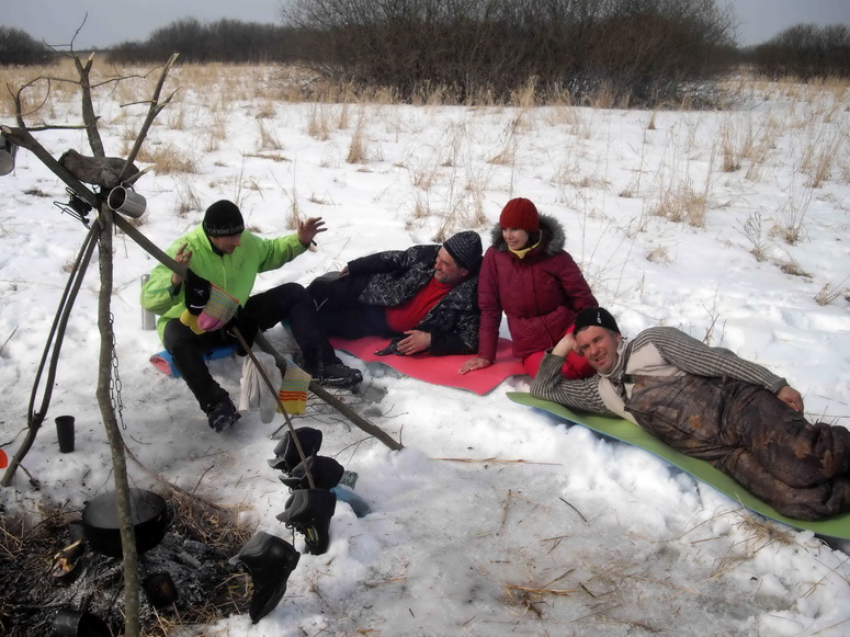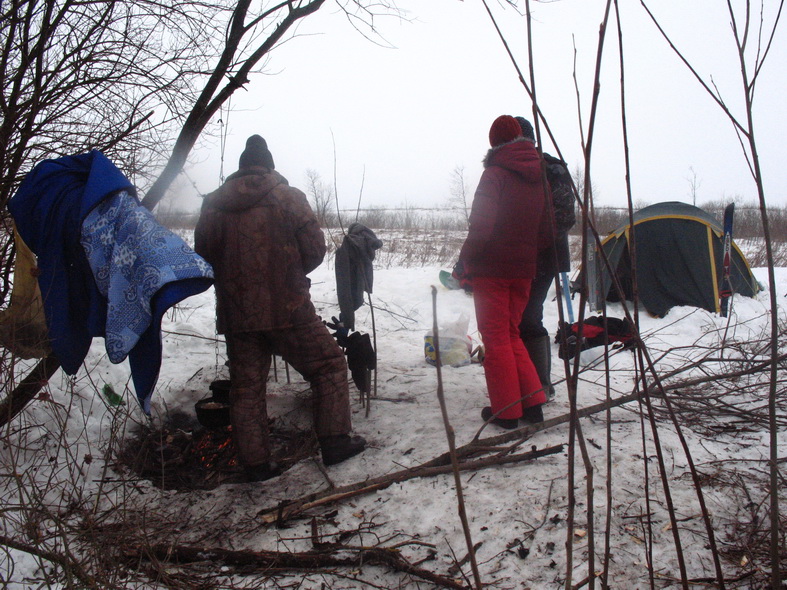 Шел снег. Уставшая Подгруппа 1 после успешно состоявшегося рандеву с подгруппой 2 (бодрой) ощутимо оживилась. Костер горел хорошо. Русьянов Андрей вошел в раж и очень охотно варил в ведре какой-то рыбный суп.