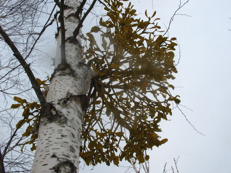 Витолина слушала матные анекдоты. Коля-Армянин рассуждал с присущей ему непосредственностью. Начинавший подзамучиваться Андрей, родственник Волосача, сардонически привалился на рюкзак. Глаз был в хорошем расположении духа и в очередной раз продемонстрировал на одной из берез вечнозеленый паразит - Омелу. Таких мы видели здесь немало. Есть архаичный обряд на Рождество целоваться под веткой омелы. Раньше её развешивали над дверными проемами. Кто пройдет в такой проем, не будет никогда знать уже горя. Даже видели березовую чагу:
