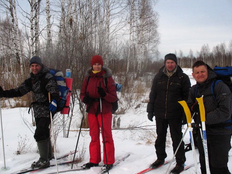Выход был здесь только один, попробовать это всё обойти. Решили вдоль канала в сторону и чуть-чуть обратно, чтобы отдалиться только от Щары, а там продолжить наш курс на северо-запад. Не боясь провалиться, двигались прямо по льду канала. Более чем полкилометра мы отдалились в сторону. Дальше действительно стало суше. Настроение в коллективе было приподнятое. Несмотря на напрочь мокрую обувь, оригинальность завершающего этапа похода действовала на комманду приободряюще. Лыжный поход получился динамичный, многоликий (особенно если идти в двух частях), экстравагантный. Движение сопровождалось экзальтированными прибаутками и оптимистическими метафорами.