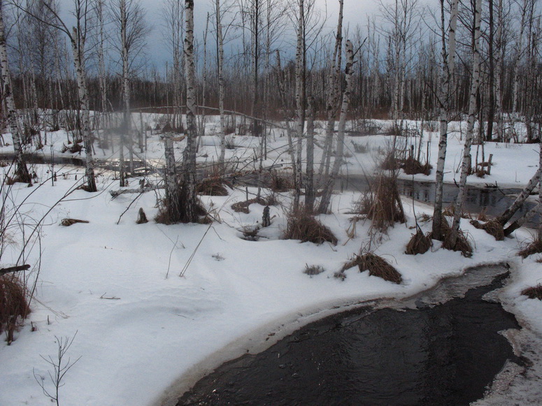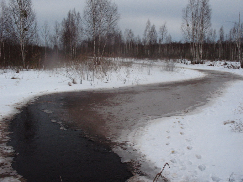 Пошел Глаз временно пешком. Сразу как не нужно по льду вдоль берега канала. Из проталины льда не далеко от моей ноги выглянула усатая голова с любопытным радужным глазом. Испугавшаяся вдруг голова ушла резко под воду, в проталине льда кольцевидно мелькнула спина. Хвост бобра тяжело ударил по воде, взметнув брызги. Пройдя еще шагов десять, я как всегда провалился. Теперь только до колена и быстро выскочил на ближайшую кочку. Воды в ботинок набраться особо не успело. Больше натекло туда со штанов.