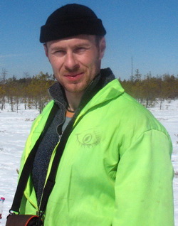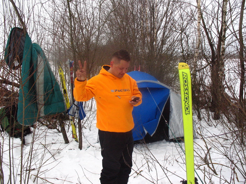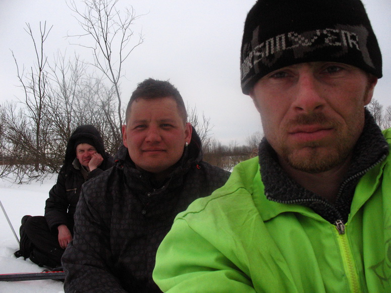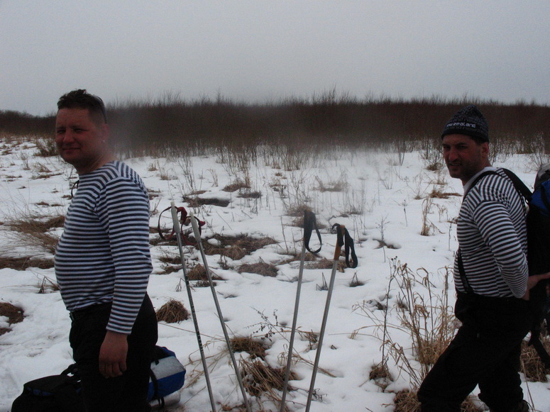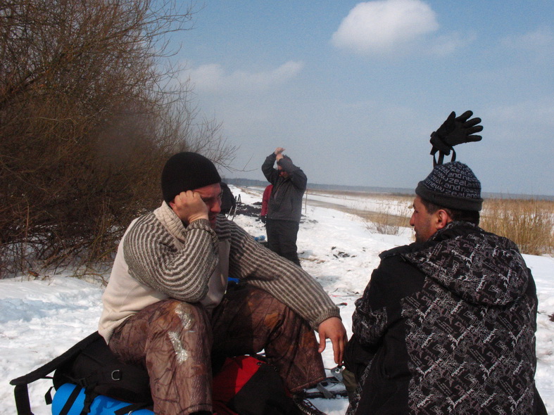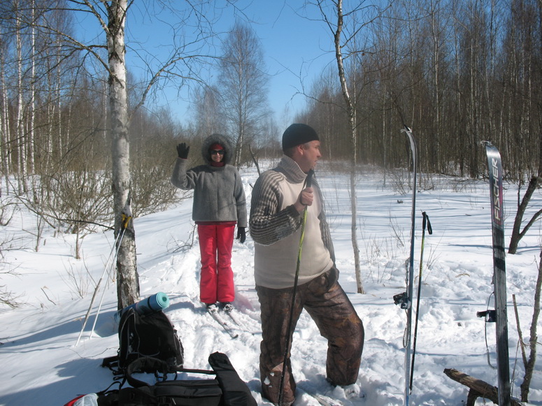 Припершийся лесник очень удивился, что могут делать здесь в этом болотном зимнем лесу, да еще и в будний день люди по своей инициативе. Приперся не с проста, заметив бдительно ведущие в направлении леса по дороге следы. Общительный Андрей Русьянов заверил лесника, что мы никакие не браконьеры, а спортсмены. Из состава Подгруппы 1 на браконьера похож был разве что он один. Правда его охотничий маскировочный комбинезон соответсвовал разве что осеннему, но не теперяшнему сезону. Остальные были обличены в категорически демаскирующие одежды.