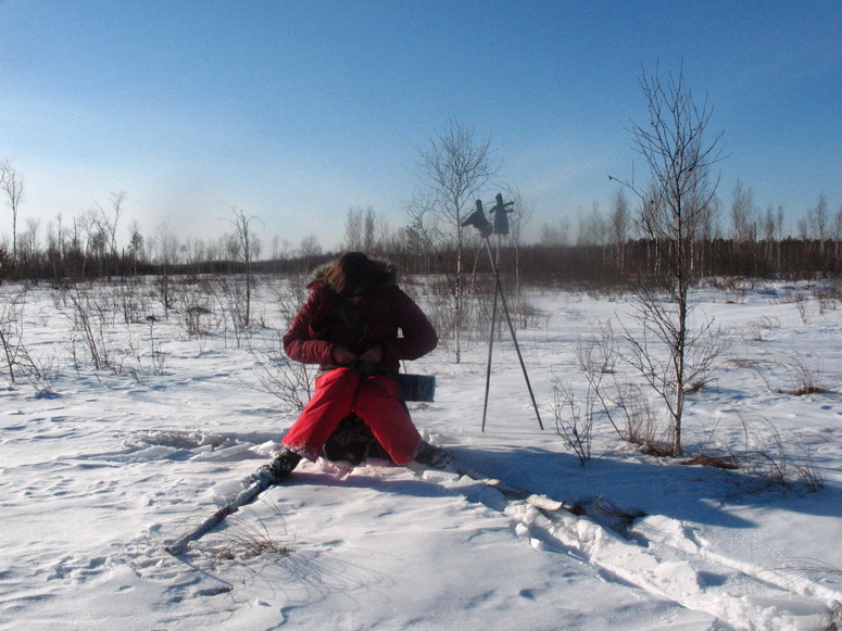 Вышли в теретьем часу ночи на станции Ганцевичи. Перон тотчас опустел. Не было навязчивых таксистов, предлагающих вечно куда-либо подбросить. Ночь была готическая. Небо полупрозрачное, без звезд. Луна светила полно и размыто. Шли мы на запад пешком на контурирующие в темноте еще более темные зубцы леса. Лыжи несли в руках. Идем, значит, это, идем. Мороз градусов десять. Было тихо. Расчищенная земляная дорога по направлению вела верно, но такой на карте нет. Неизвестно, зачем она здесь и куда, в чем надобность ездить на болото. Снега тут в Брестской области меньше, чем у нас в Минске. Но по бокам дороги он лежал уверенной пока еще целиной. Предвесников не было. Ничего, даже косвенно не давало понять о приближении в этом году "забухавшей" где-то весны. Вошли в лес. Расположились. Костром решили не заниматься, поскольку и без того пять утра. Глаз назавтра соорудил, чтобы вышло оперативнее, таганок и вырыл яму.