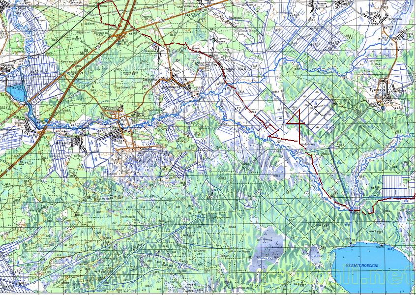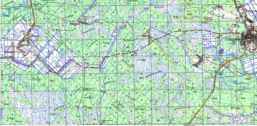 Первым шел Климович. Шел хорошо, но тяготился к реке. Даже приблизились мы снова к затопленному. Глаз вдруг отошел в сторонку и узрел вдалеке контур в виде паралеллипипеда - какой-то сарай. Нам явно туда. Дальше будет земляная дорога к деревне Сельцы. Через сорок минут после пробирания по просекообразному корридору между кустов мы были возле этого строения. Им был старый заброшенный свинарник. Он расположился на небольшой горочке, поэтому и заметен был издалека. Рядом сохранились силосные траншеи.