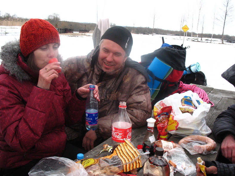 S.klim советовал привязывать. Только что-то ребята не хотят их привязывать. В каждом лыжном походе есть человек или несколько, который (которые) теряет (теряют) эту злосчастную скобу. Два спальника я подцепил снаружи рюкзака. Палатку-четверку брать в нагрузку было уже не с руки. Будет снег идти, под тентом у мальчишек переночую. Нет, так на улице. Взял Андрей с собой и какого-то прикольного сала. Его я не забрал умышленно, чтобы был стимул ему приехать вновь и к нам присоединиться. Прощались вязко и сверху как следует поддали.