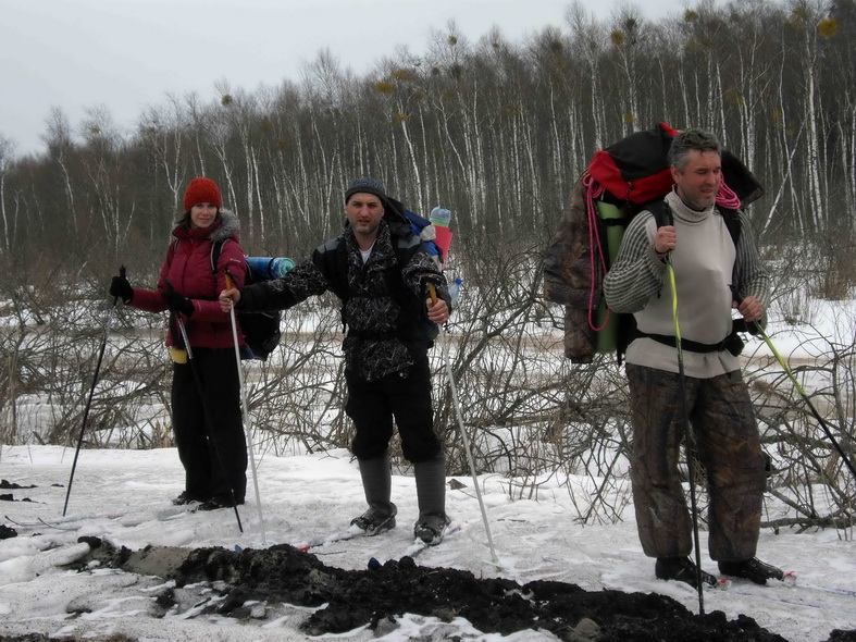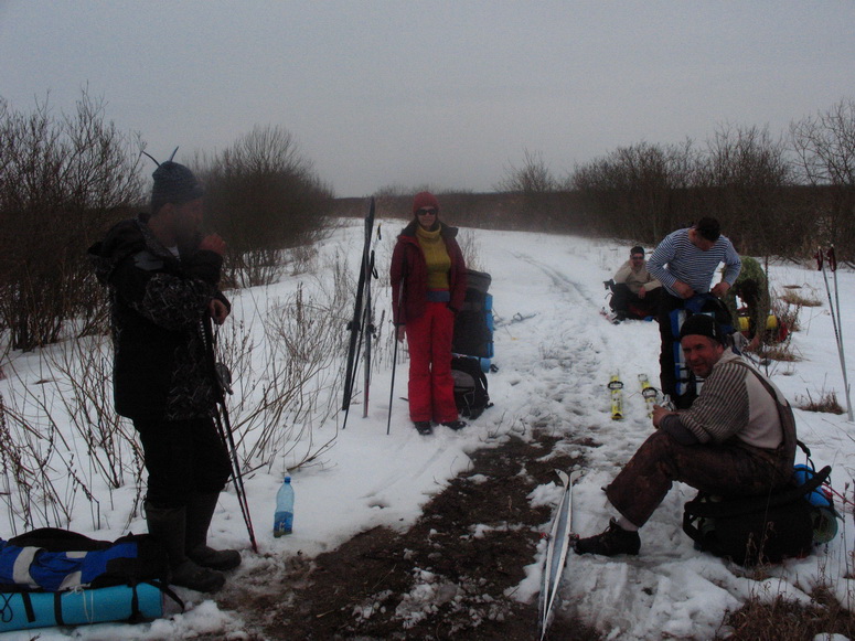 На пригорке стаял снег и обозначилась земляная лысина с колейной дорогой. Опрометчиво даже решили, что якобы лыжи больше не нужны. Думали переквалифицироваться дальше в пешеходы.