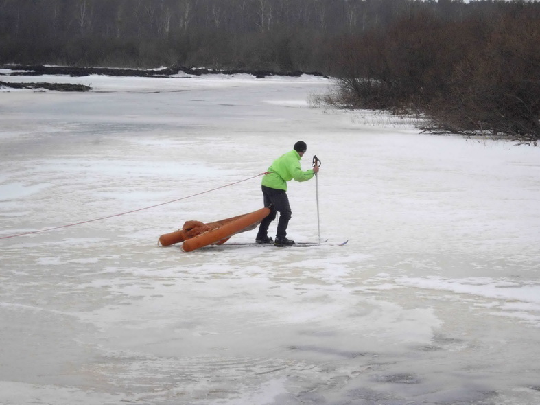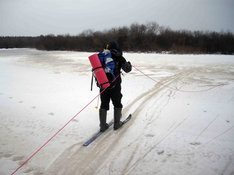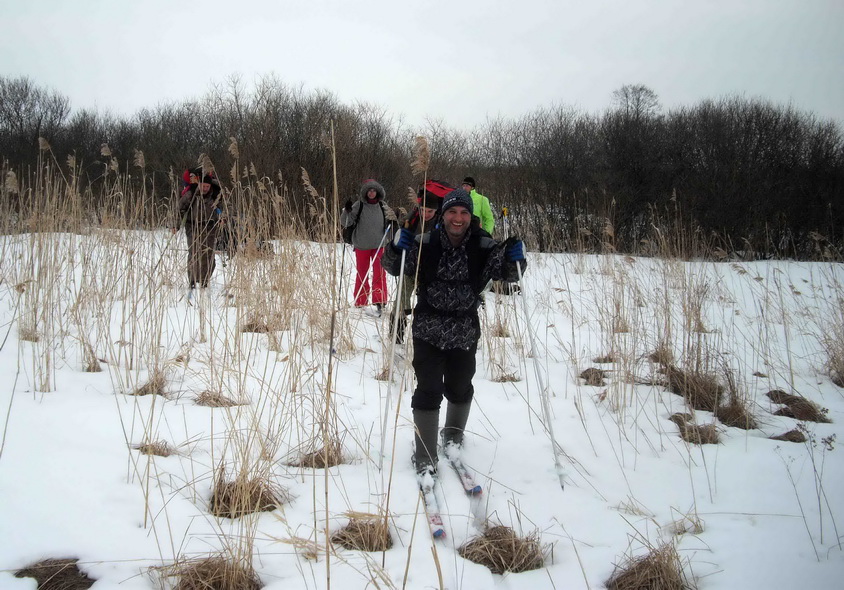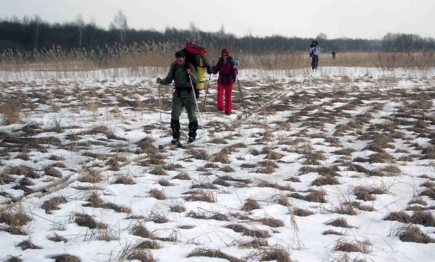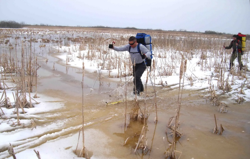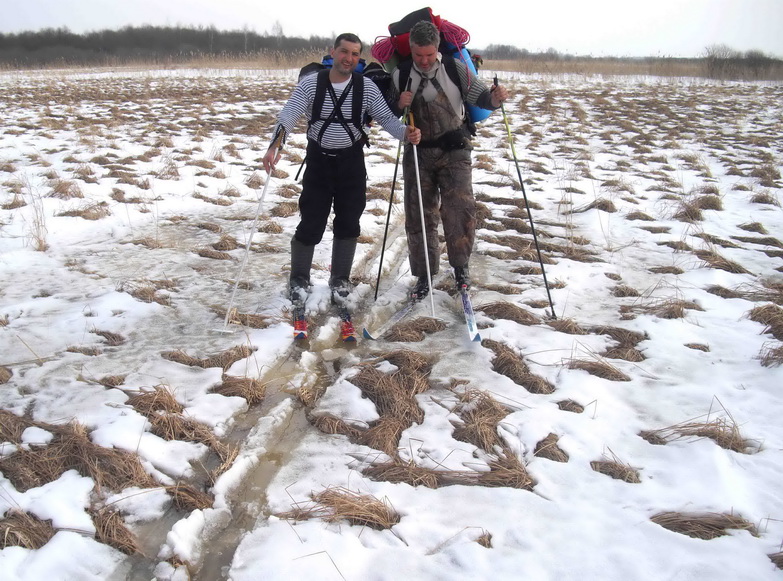 Вышли запоздало. Снег, скрепленный морозом за ночь, на солнце быстро раскис. Мы довольно споро преодолевали обширные луговые расстояния по мокрому - постоянно по шугообразной консистенции между рыжих стеблей прошлогодней болотной растительности. Скользили лыжи хорошо, как и весь этот поход. Теперь остатки снега выступали не столько опорой, сколько смазкой. Как и весь этот поход, никогда не отдавали назад, как это бывает по пухляку и первоснежью. Были немногочисленные сухие участки, но это только первое время. Вскоре и шуга стала уже не шугой, а шли мы истинно на водных лыжах, раздвигая носиками воду. Идти стали уже не строго, куда нам надо, а куда получается.