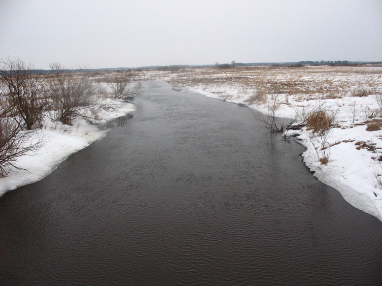 Непрерывно и быстро мы прошли по прямой на лыжах отрезок земляной дороги к деревне Сельцы. По мосту перешли темную воду, освобожденную ото льда, текущую в снежных берегах реку Мышанку.