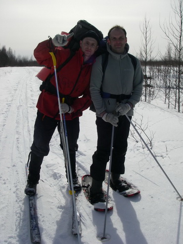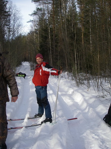 Снег искрился на солнце. Лыжня, сделанная в понедельник угадывалась очень отчетливо. Снег за это время не шел, да и ветер её не замел. Да и не нужна теперь эта лыжня. Сейчас уникальная пора, которая бывает у нас не каждый год - мартовский наст. Наст - доскообразный снег. Можно даже идти и почти без лыжей. Один человек - Трусов - так и сделал, правда, шел он теперь в снегоступах, сильно хрустя снегом, но нисколько на удивление от лыжников не отставая. Я, признаться, со снегоступами не очень знаком и даже их недооценивал. Надо тоже будет приобрести.