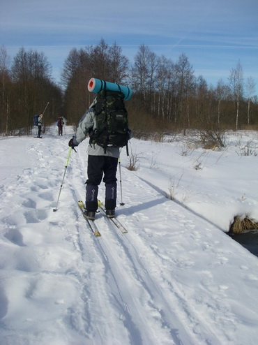 Двигались мы на северо-северо восток и уже вскоре миновали Староборисовскую трассу. По ней плыл в обе стороны поток машин. Выждав момент, перешли не снимая лыжей, шлепая по асфальту, как на протезах.