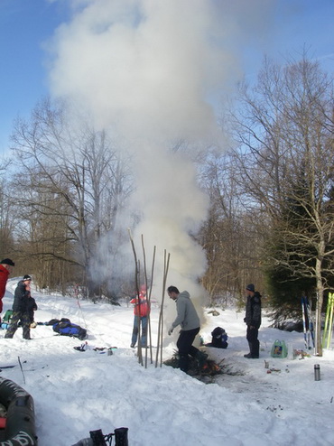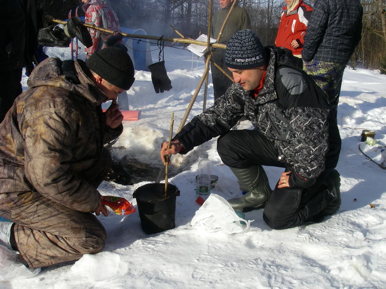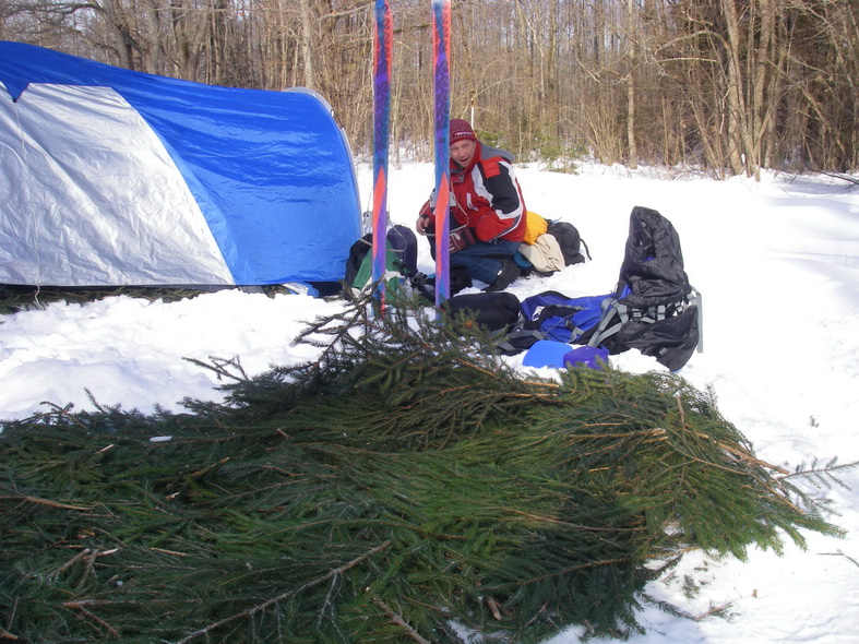 Поход проходил традициям вопреки. Поднялись не то что ни свет ни заря, но по нашим меркам очень рано. Потому что пришли еще засветло и гудели не до утра, а только до ночи. По толстой шапке конденсата под куполом палатки я сразу же догадался, что температура ночью была прилично за десять. Снаружи доносился рассудительный бенефис Андрея Русьянова и поощрительные голоса подыгрывающих ему актеров. Как всегда в мороз много питания пришло в условно непригодный вид: бронебойные киви, каменные мандарины и железные куриные яйца. Костер горел в глубокой яме. По периферии кострища образовались игольчатые вытаивания.