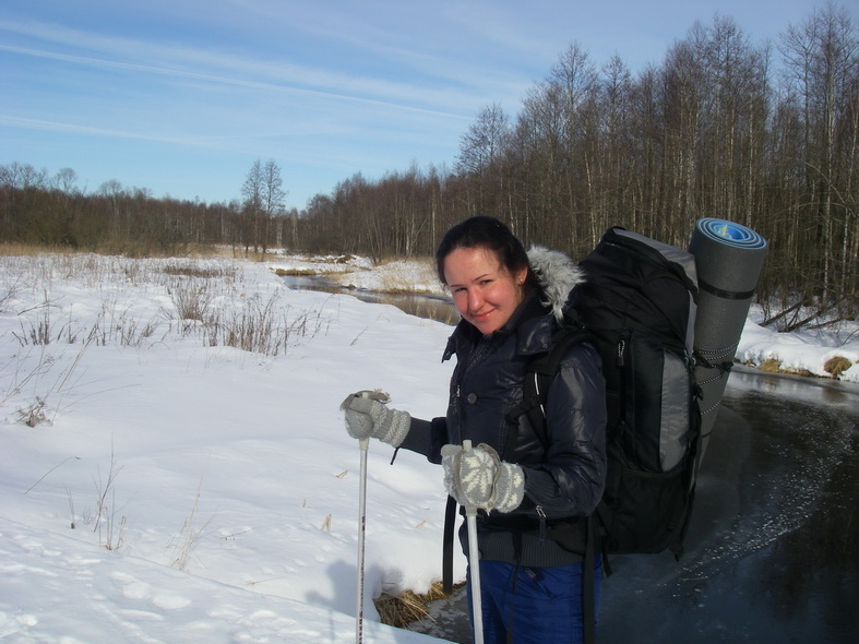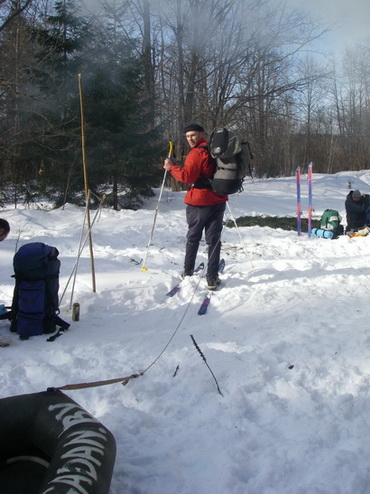 Я два дня не спал, посему сектреная экологическая "тропа Гайна-стайл" меня уже основательно задолбала. Из этих примерно 18-и километров последние несколько уже были тягостны: казалось, эта лыжня никак не закончиться. Стали лагерем неподалеку от реки. Я подходил ближе и удостоверился, что да, это Гайна, что нам и нужно. Даже разведал место для переправы.