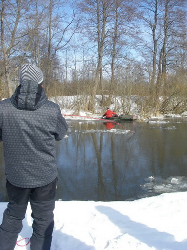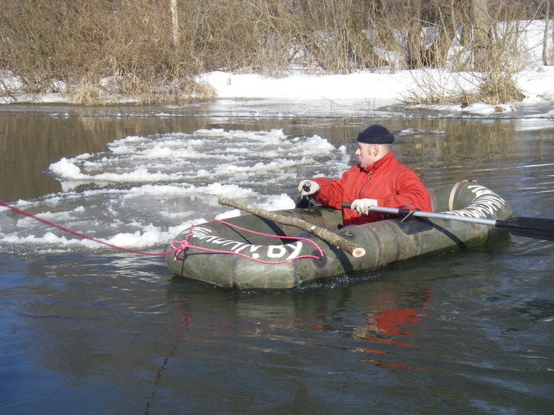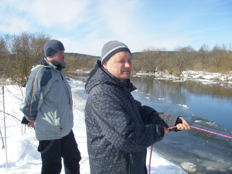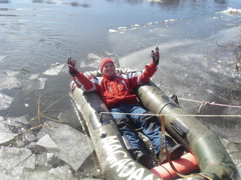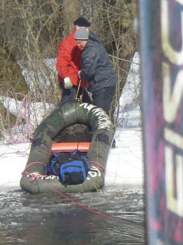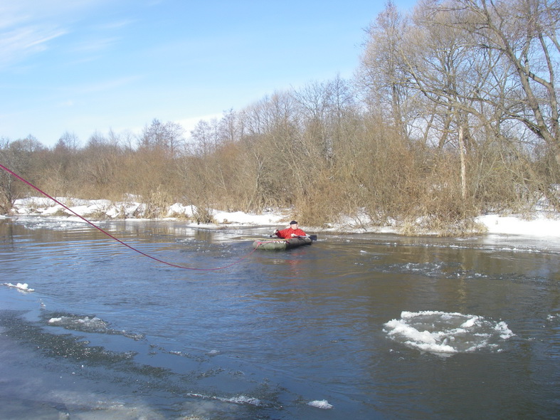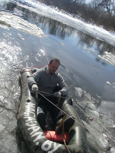 Глаз пререехал реку без особого труда. Делом времени было разбивать ледяную закраину с той стороны. Вылез я, Глаз в не очень удобном месте. В удобном потом добил лед Лысый. Рюкзаки, лыжи, физических лиц перетянули челночным способом. Льдины шли по реке удобно, в один ряд и цепочкой, причем занимая только определенную часть профиля русла. Удобно было наметить лазейку и проскочить. Проскочить - тот кто на правом берегу подтягивает на себя, придерживает; как намечается лазейка сдает, а партнер с левого берега начинает вытягивать.