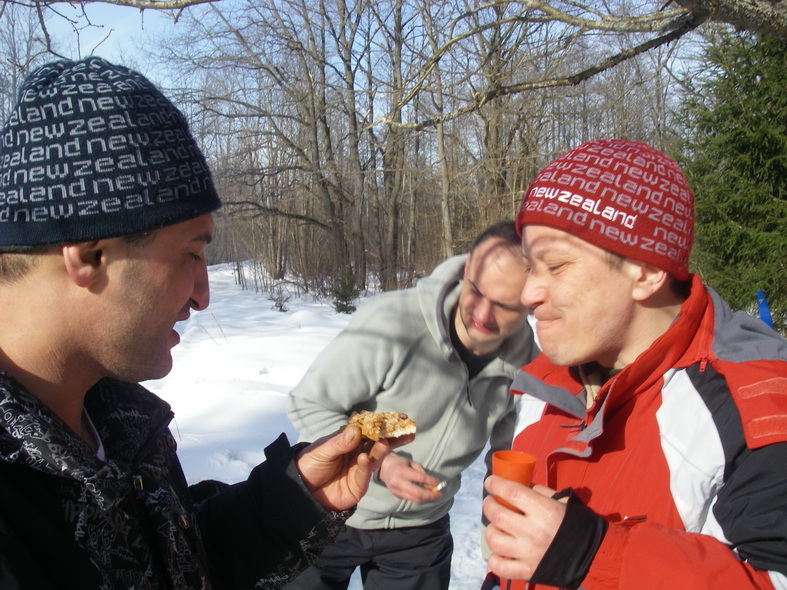 Две деревни мы прошли по укатанной дороге. Можно было не передвигать ногами, а толкаться только лишь палками. Во второй деревне - Мехеды, общительный Андрей познакомился с какой-то одинокой бабулей. Снова в лес за этими самыми Мехедами. Лес самого лыжного вида. Довольно немолодой и в основном хвойный. Подлеска почти нет и расстояния между деревьями такие, что на лыжах идти хорошо и негде не нужно щемиться. Сделали еще один из привальчиков. Шли мы с запасом примерно в час. Можно было уже скоро примерно звонить водителю. Андрей рассказывал матные анекдоты про садомитов. Анекдоты постепенно перешли в злобный монолог. Волосач тоже рассказал какую-то сальность. Вернее, он рассказывал её до этого Глазу. Глаз попросил ещё повторить вот теперь, полагая, что засмущается при Ксении. А он, это, ничуть не засмущался и давай рассказывать, что больше засмущался Глаз и сам. Пробовали перекусывать тем, что окончательно не замерзло. Киви можно было чистить ножом, как картошку. Максим нарезал розовыми крапчатыми кольцами колбасу.