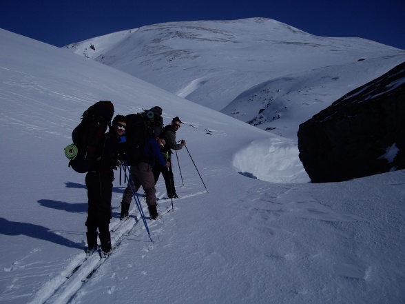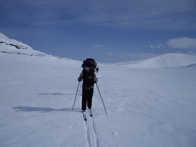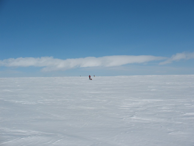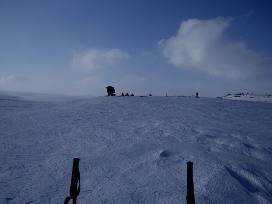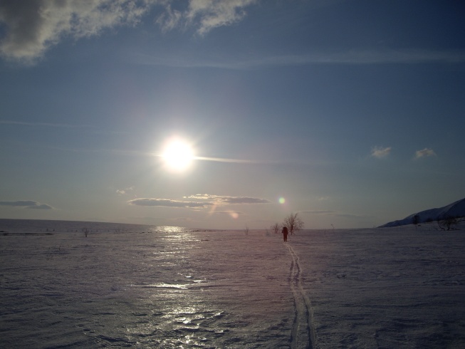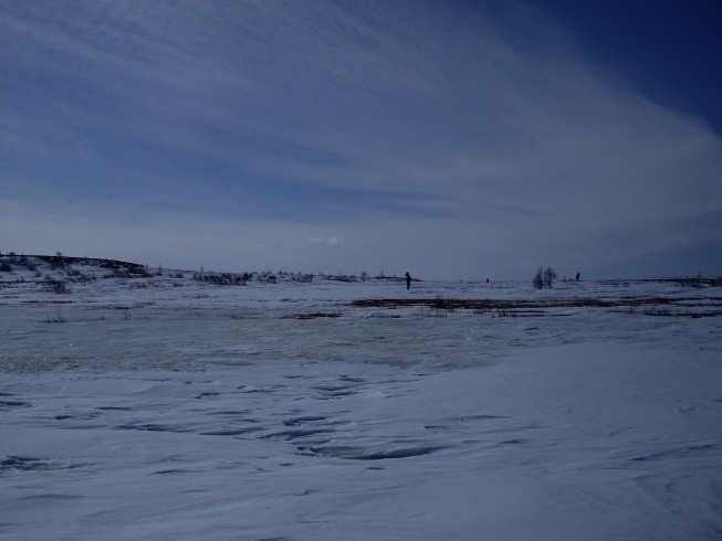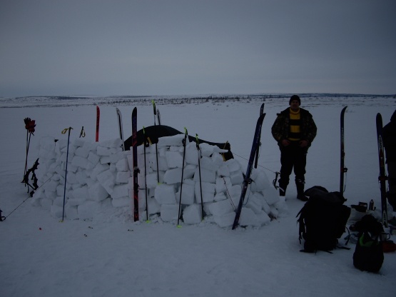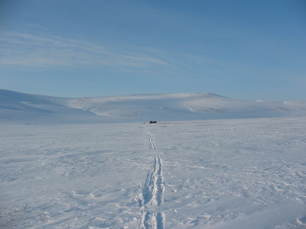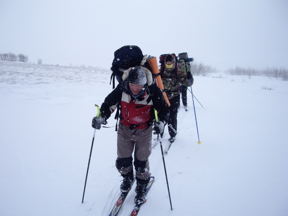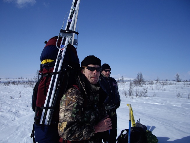 День был ясный, солнце в дымке. Но даже в дымке оно так било по глазам, что без очков трудно было глазам. Лагерь собрали, шоколадку подобрали. Глаз даже усилил лямки своего рюкзака, не помню какой, хирургической ниткой. Вес за плечами у каждого был приличный, звезд с неба решили не срывать и запланировали ограничиться на сегодня двенадцатикилометровым переходом. Идти предстояло просто на лыжах по тундре.