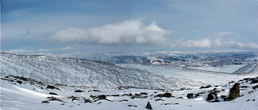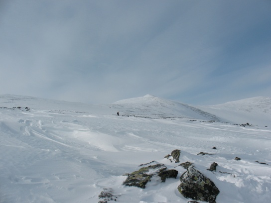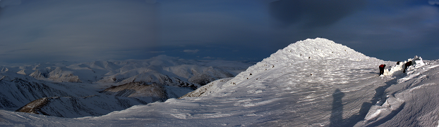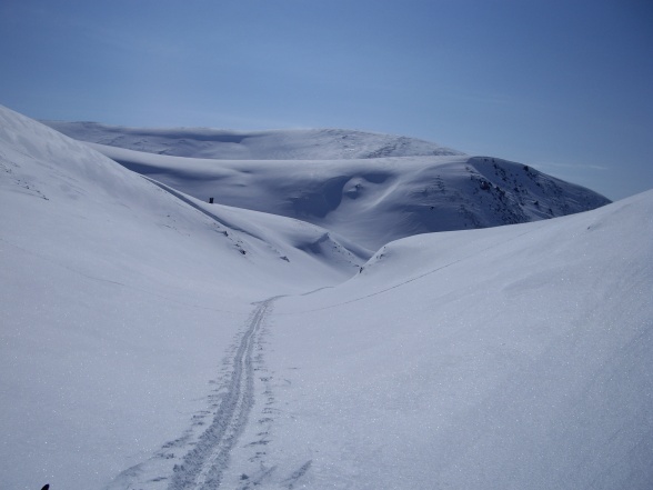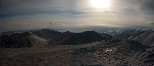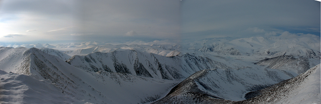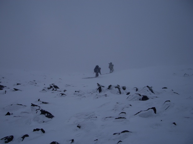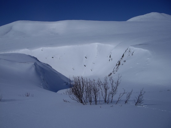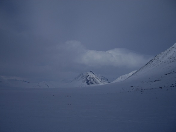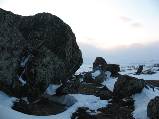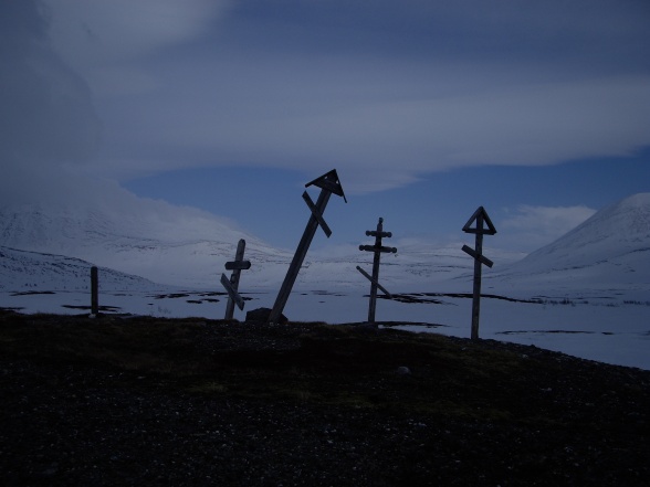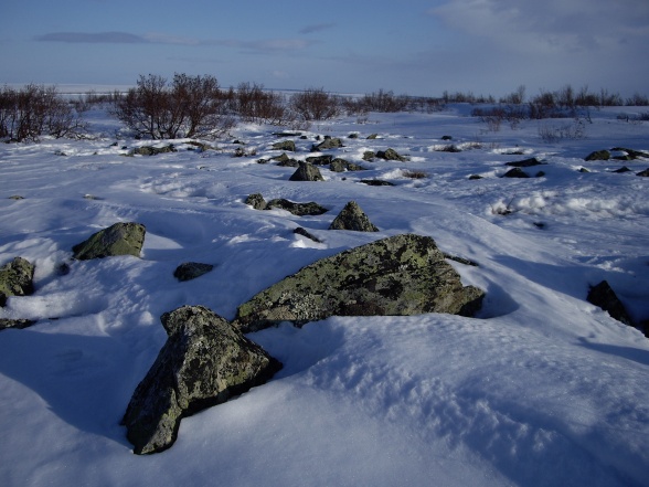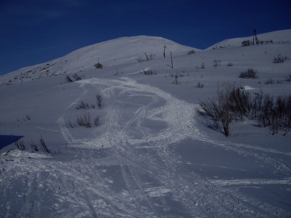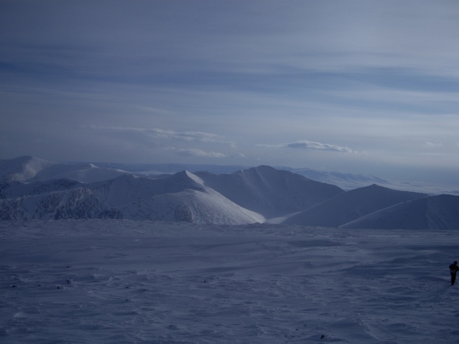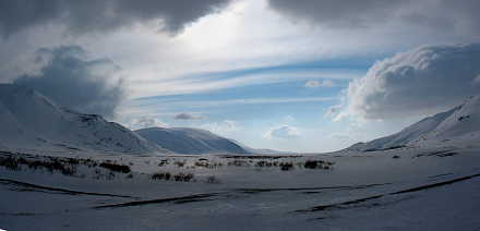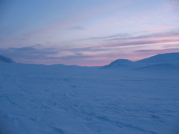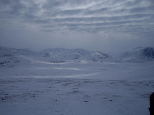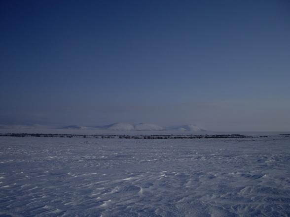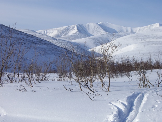 Шли на северо-восток. Раз в сорок минут останавливались отдохнуть. Было даже и жарковато, поснимали куртки. Карта была весьма точной. Привязывались к высотам. Снег был уложен неравномерно, лоскутами-застругами, причем его как-то было маловато, не до конца были даже присыпаны прутья карликовых полярных кустов. Где какие распадки пониже – там было сиротливое редколесье в виде невысоких кривых лиственниц. Пейзаж был очень диковинный, лунный и совершенно мрачный