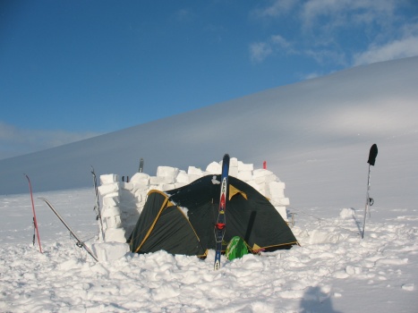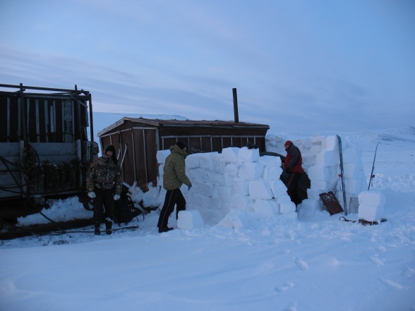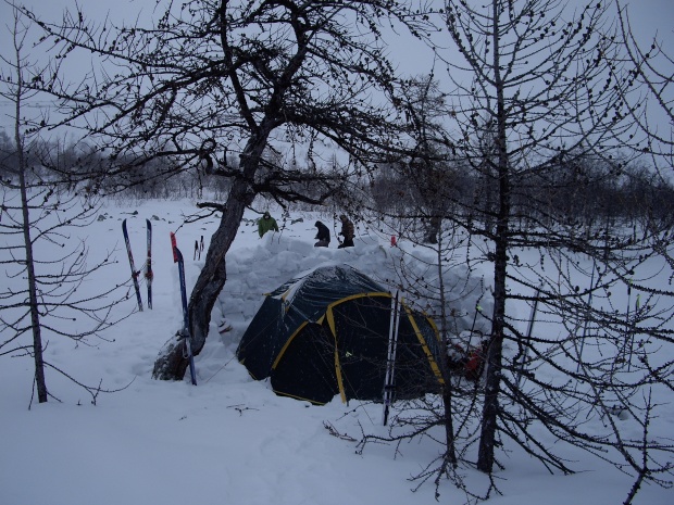 Ветер какой-то обманчивый, было непонятно, с какой стороны строить ветрозащитную стенку. Сделали мы ее по первому разу примитивно. В целом, однако, было уютно. В километре светили те самые прожектора, со стороны Харп доносились звуки железнодорожного происхождения.