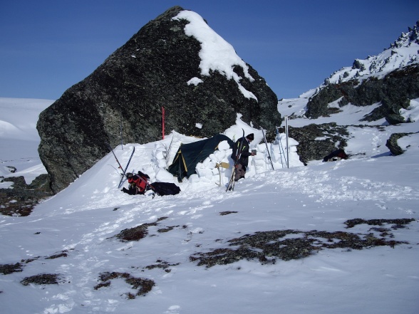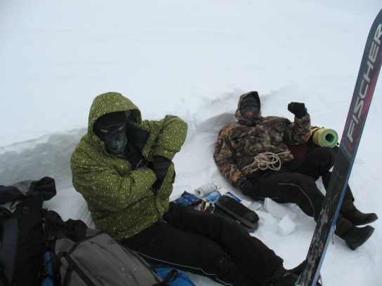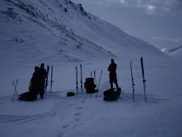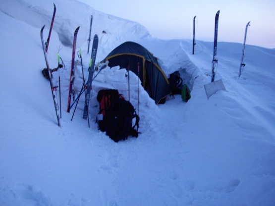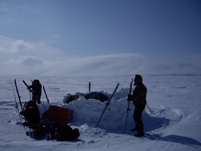 На лед реки спустились по крутому берегу траверсом. Здесь был такой снежный перемет, чтобы как раз заночевать с минимальными затратами. Снова варили бэрло. Осталась как раз последняя банка. С продуктами получилось все как раз кстати. Голодными мы никогда не были, но как будто ничего лишнего и не осталось, если не считать газовых баллонов. Но у нас иногда были и костры. Баллоны остались поэтому. Да и вообще лучше со стратегическим топливом перестраховаться: без еды еще пол беды, а не будет газа, можно остаться и без воды.