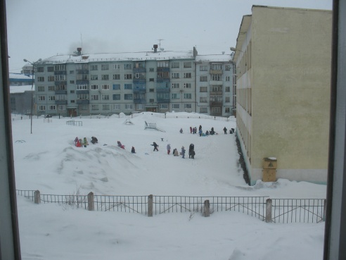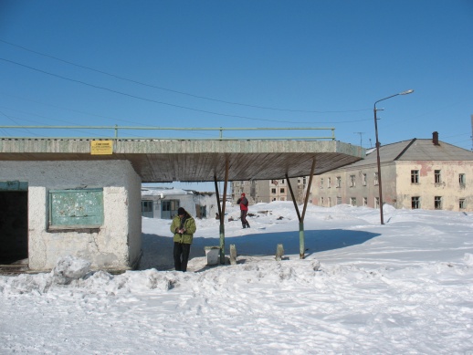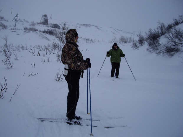 Большее впечатление произвел на нас сам поселок. Среди снежной целины стояли пятиэтажки. Никаких деревьев, только редкие ущербные кустики. Обилие строительного мусора. А большинство этих домов или полностью или частично не были жилыми, зияли черными провалами окон. Грязно розовый и голубой цвет стен смотрелись как-то особенно абсурдно. Все это было похоже на декорации к новому поколению игр стрелялок (нынче в моде совдеповская тематика). Для меня это все развлечение и экзотика, но кому-то здесь и жить. Я хоть и мизантроп, но честным людям всегда посочувствую.