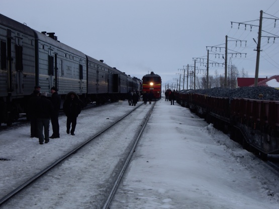Поезд шел по голой тундре. На некоторых участках снег был просто сдут ветром, и они были лысые. Вообще снега оказалось меньше ожидаемого. Сорок минут стояли на станции Елецкая. 4 градуса тепла. Погода сумрачно-прозрачная. В сорока километрах виднелись "Бархатные Горы Украины". Какая из них Пай-Ер, правда, разглядеть было нельзя. К приезду поезда собралось несколько буранов с санями, имеют, должно быть, здесь статус такси. Станцию разглядели с любопытством. Глаз соизволил выбраться из вагона, благодаря навязчивости Чичи, который доставал меня на каждой большой станции. Множество, имеющих какое-то хозяйственное значение, бараков, металлолом, вагоны, мрачный тепловоз с зажженным прожектором, и неизвестно каким образом оказавшийся здесь, стоящий среди барханов заснеженного угольного шлака и накренившийся на бок, речной катер.
