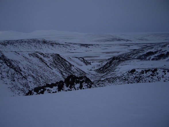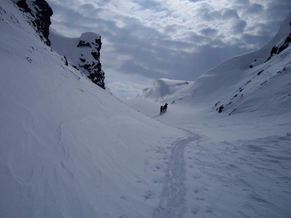 Спустились в каньон реки. Здесь не так задувал ветер. Мы шли на лыжах в коридоре между неровными гранитными обрывами. Снег уложен был тоже неровно. То чрезмерно обильно, образуя переметы и надувы, то вообще обнажался голубой лед: снега не было и вовсе.