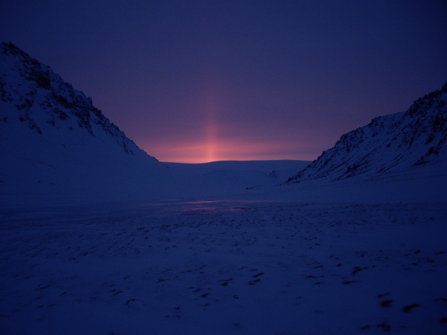 След оказался гораздо дальше от реки, чем это предполагалось. Мы шли по этому следу навстречу садящемуся солнцу. След искрился розовым светом. Настала тишь. При этом явственно почувствовалось, что мороз сегодня какой то необычный. Действительно, было холоднее.