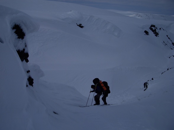 В первый день, как обычно, рюкзак еле вскидываешь, на Полковника его кто-либо навешивал. На лыжах держались не очень уверенно. Подмазали мазями, чтобы была поменьше отдача – помогало. Сергей за собой тянул на карабине своеобразные саночки, которые имели каплевидную форму (составлены и сошнурованы из двух). В этих саночках лежало то, что потяжелее, – консервы. Рюкзак Сергея был полегче наших ощутимо. Я не ожидал, что эти саночки будут настолько эффективны. Для следующего зимнего похода решено было изготовить нечто подобное.