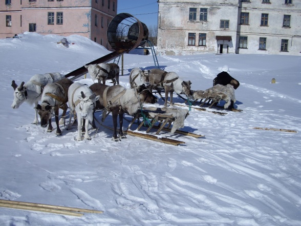 Ненец Егор доставил нас к культурному центру поселка. Тут было два магазина, почта и какая-то контора. Стояли те самые оленьи упряжки, что мы видели.