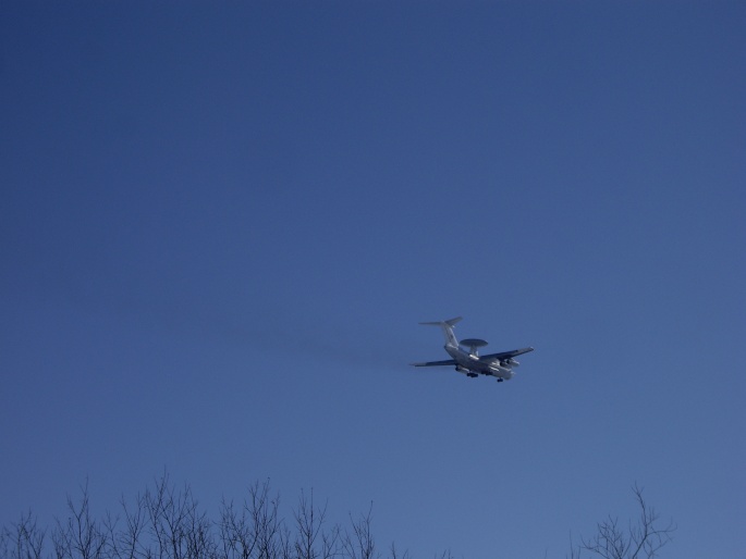 Неожиданно возник тяжелый гул, который усиливался и приближался. Из-за домов, словно гигантский шмель, вылетел, сбрасывая высоту тяжелый ИЛ 76. Самолет был снабжен параболической тарелкой на фюзеляже (пограничный вариант). Он приземлился совсем рядом, разрывая воздух ревущими реверсами. Посадочная полоса видна не была из-за рельефа.