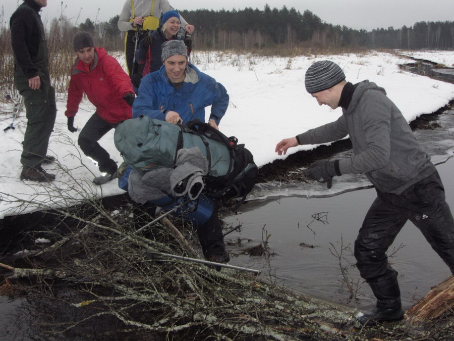 Поиски решения привели к чему-то вроде бобровой плотины, довольно условной, но после усиления ее сучьями и лыжами превратившейся в сносный мост, по которому можно было почти сухо пройти. Переправили рюкзаки, заодно оценив степень индивидуальной нагруженности каждого из участников, лыжи, перебрались и сами. Почему-то обошлось без потерь, как в снаряжении, так и в личном составе.