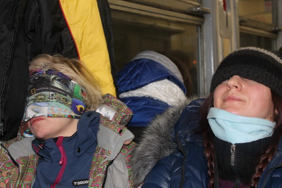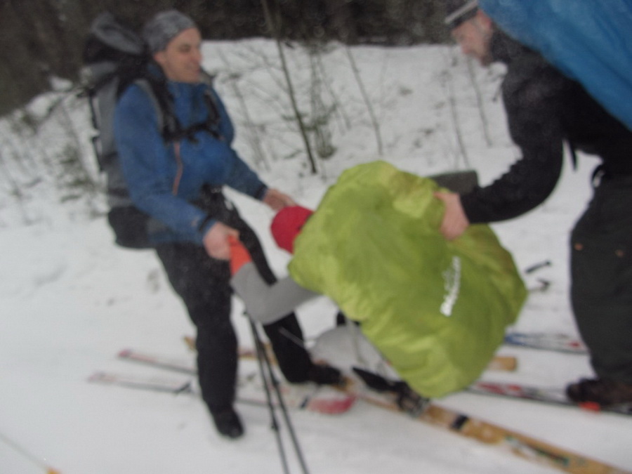 С помощью нескольких людей, которые отправились в лыжный поход, имея представление о том, как пользоваться лыжами, все более или менее всё настроили, подогнали, застегнули и прикрепили, после чего произошло начало движения.