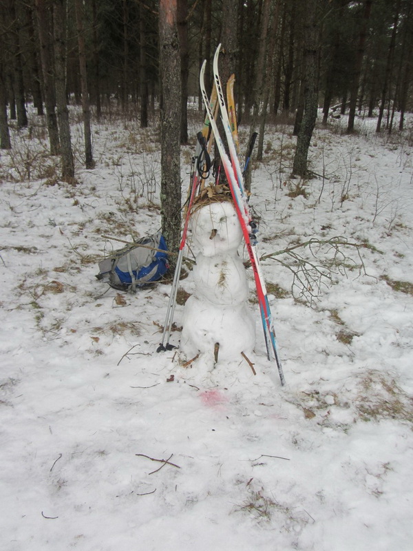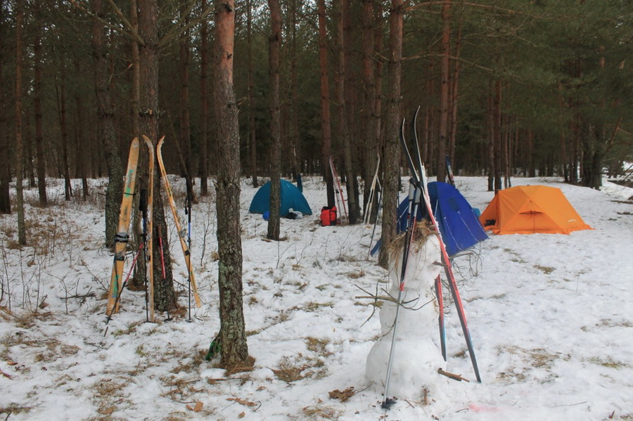 Напряжение нарастало, а обозначенной на карте дороги к дачам и затем уже искомом озеру всё не было. Движение же стало уже просто опасным: был риск в темноте свалиться в воду. В итоге расположились возле снеговика у некой то ли тропы, то ли просеки, которая и выполняла функцию показанной на карте дороги.