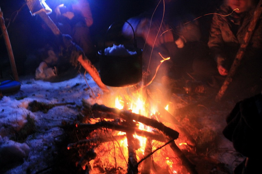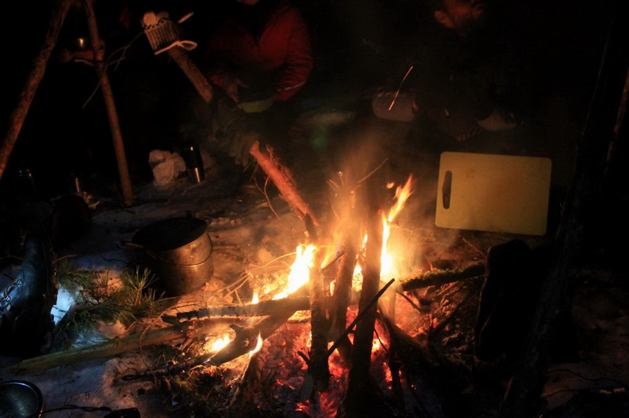 Костер развели споро, расставили палатки. Наконец стало понятно, что же находилось в абсолютно неподъемном рюкзаке Вани: циклопических размеров (особенно изнутри) саморакладывающаяся палатка и чугуниевый котел на 6 литров. Шеф-повар, побуждаемый голодающими туристами, со всем возможным рвением принялся готовить ужин. Тем временем ответственные лица приготовили глинтвейн, пришедшийся как нельзя кстати.