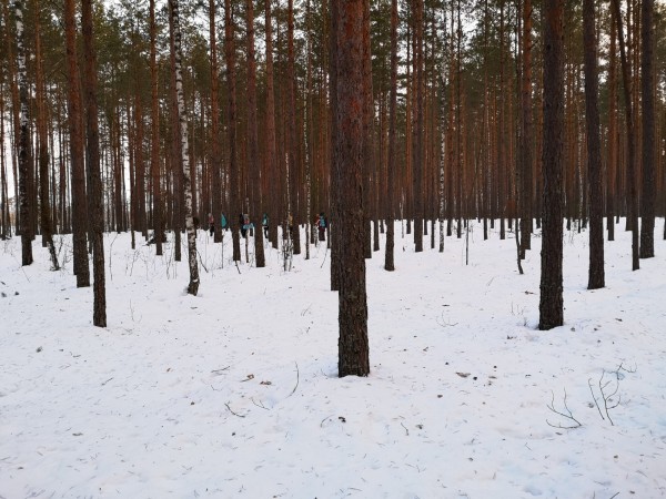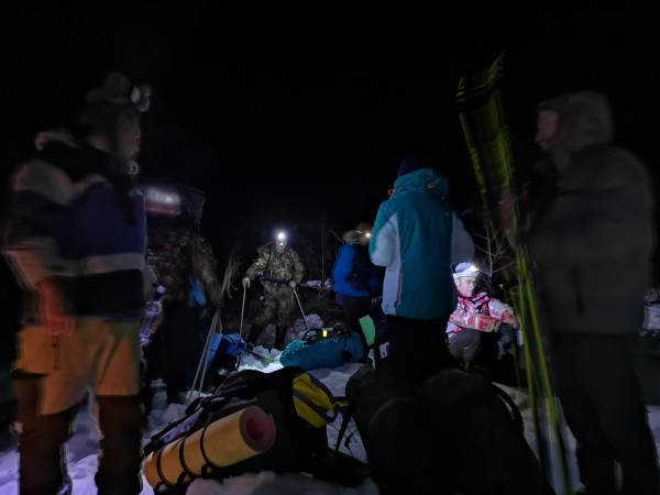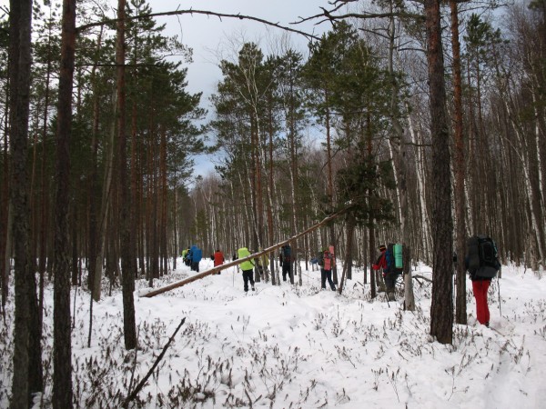 Лыжники растягивались, и забавно было сначала видеть впереди пятна света, а затем обгонять буксующих в снегу пешеходов. Через какое-то время лыжня затерялась в лесу и нужно было дожидаться Глаза для понимания правильного пути. Все постепенно подтягивались и садились на рюкзаки в ожидании.