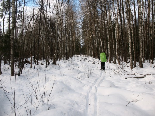 И вот долгожданное болото. Здесь Глаз решил устроить тропежку равными интервалами со сменой лидера, но метров через 300 нашлась готовая лыжня и план потерял актуальность. Был где-то час дня.
