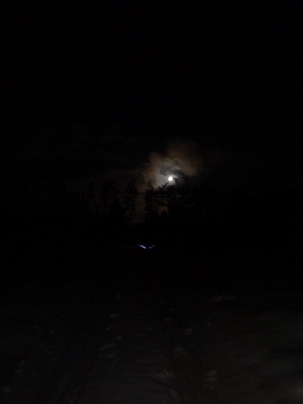 Дальше шли с заженными фонарями. Приподнятое настроение не покидало меня вплоть до перехода на обледеневшую укатанную лесную дорогу. Верные весь поход лыжи здесь внезапно задались целью посадить хозяйку на шпагат, ноги упрямо разъезжались. Довольно быстро я переместилась из авангарда в хвост. Лыжню найти не удавалось, напомнил о себе и тусклый фонарь. От окончательного уныния спас замыкающий Гюго, предложив снять лыжи и поменявшись со мной фонарем. Жизнь снова заиграла яркими красками.
