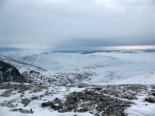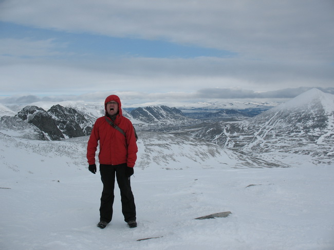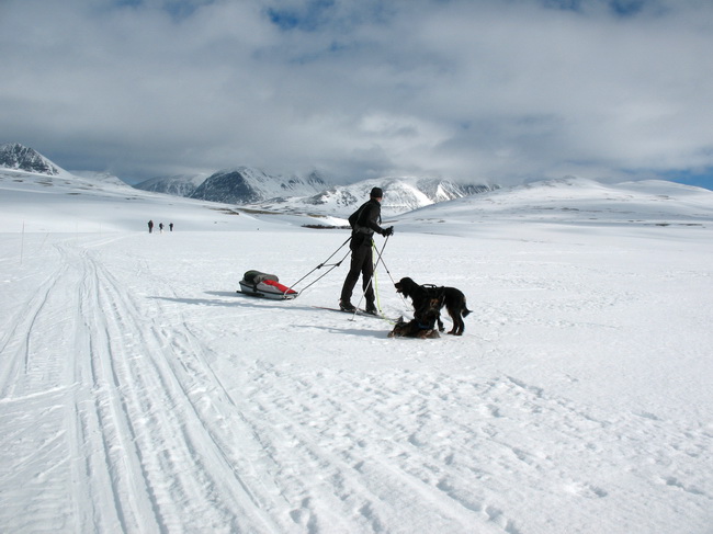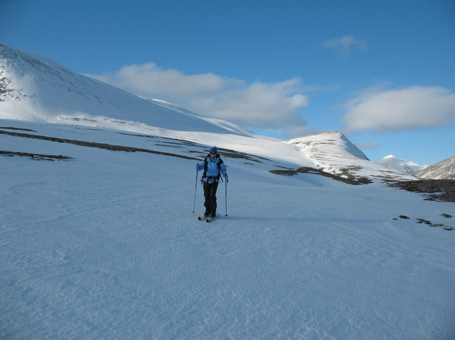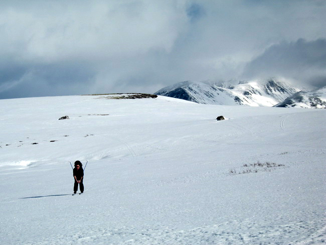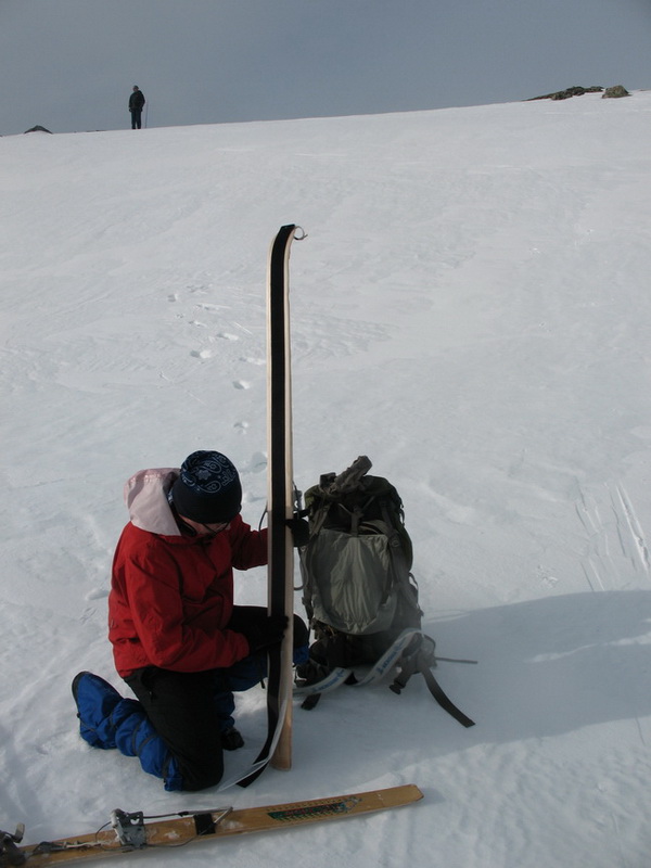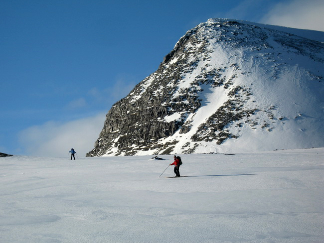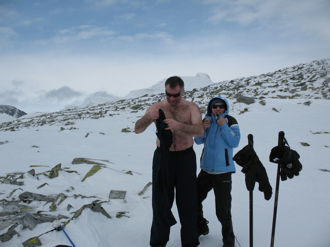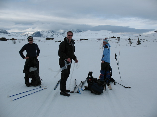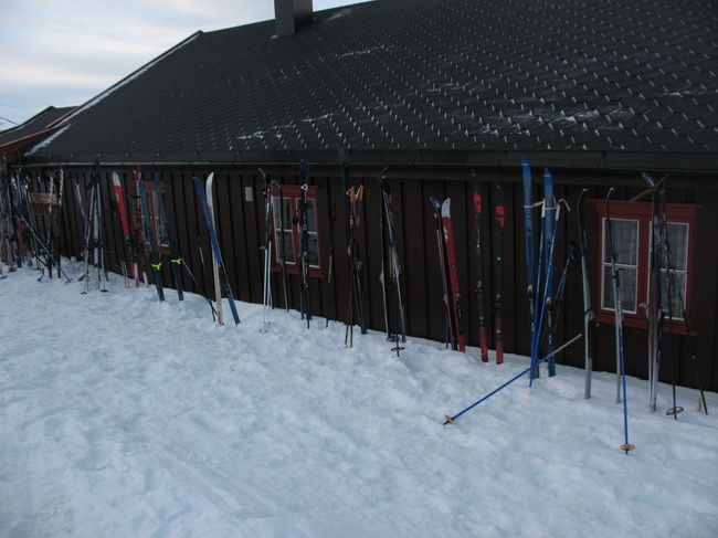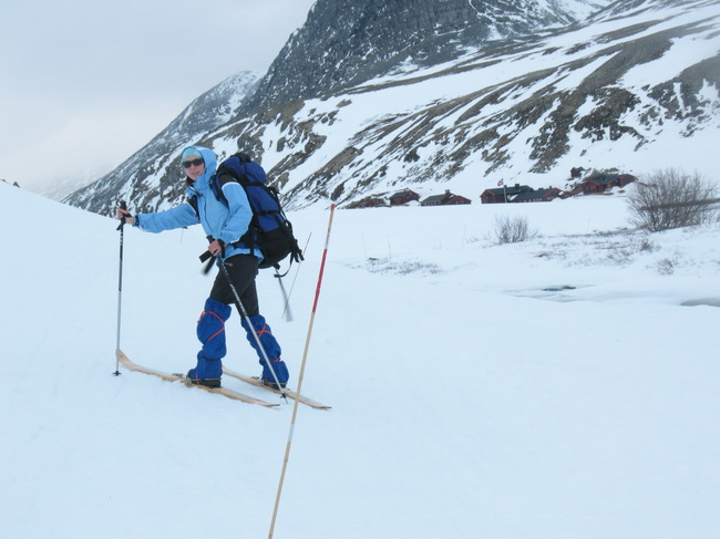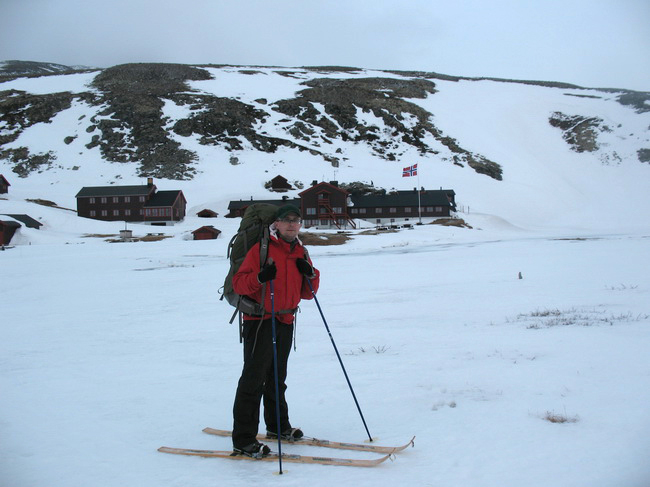 Позавтракав по шведской системе, вышли на маршрут. Тургостиница находится в долине окруженной десятью вершинам более 2000м. Выбрали ближайшую с подветренной стороны Veslesmeden (2015 м). Все обитатели «хижины» копошились на крыльце. Кто подгонял других, кто допаковывал вещи. Я же с удивлением разглядывал калоши одного из норвежцев. Они представляли собой обрезанные до щиколодки армированные резиновые сапоги, которые были намертво прикреплены к лыжам. Норвежский паренек просто вставлял в них свои ботинки и поджимал крепление. Кстати в Норвегии для бахильных галош тоже используется термин «гамаши», который по-норвежски звучит также, как и по-русски.