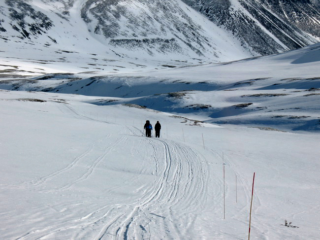 Дальнейший спуск проходил в прежнем режиме. Шел сразу укатил вниз и к нашему возвращению в хижину уже успел даже принять душ. Мы с Олей не могли двигаться в таком темпе и медленно ехали вниз. Свейн кружил вокруг нас. К четырем часам мы были на месте. Итог дня: 800 метров по вертикали и 11 км по горизонтали.