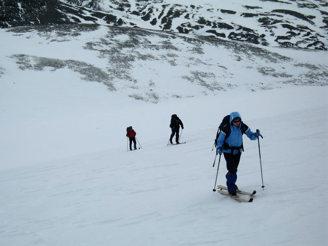 Я шел на них впервые, но смог их по достоинству оценить. Лыжи без особых проблем держались на фирне с уклоном до 30 градусов. Без камусов, по такому уклону пришлось бы идти пешком, что было бы проблематично, так как ноги даже сквозь фирн проваливались по колено. Погода раздражала своей переменчивостью. То солнце жарит - и приходится раздеваться чуть ли не до термы, то нагонит туч ветер, и приходится снова облачаться.