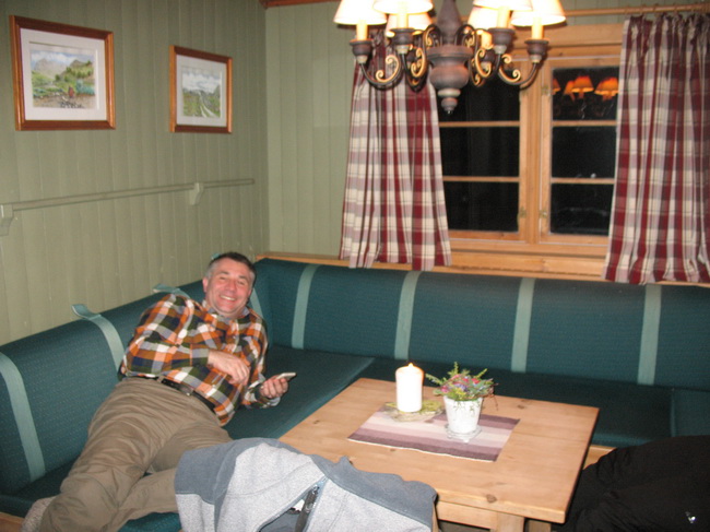 Рядом сидел полный норвежский клон Алены Климович, и, казалось, что вот-вот, и она сейчас заговорит по-русски. Ужин из трех блюд норвежской кухни оказался шикарным. Ресторанного уровня. Рядом с рестораном находилась гостиная комната, где мы, лежа на диванчиках, провели остаток вечера, восполняя водный дефицит, кто чаем, а кто пивом. Рассказывали, как это водится в походах, различные истории около костра. Правда, роль костра выполняла свечка. Про то, как Шел, служа во флоте, участвовал в спасении российской атомной подводной лодки, про рыбную ловлю камбалы и лосося, про то, кто и как нарушает правила дорожного движения, про мусульман и расизм. А закончили разговор политической маевкой.