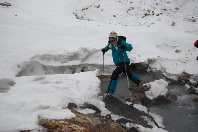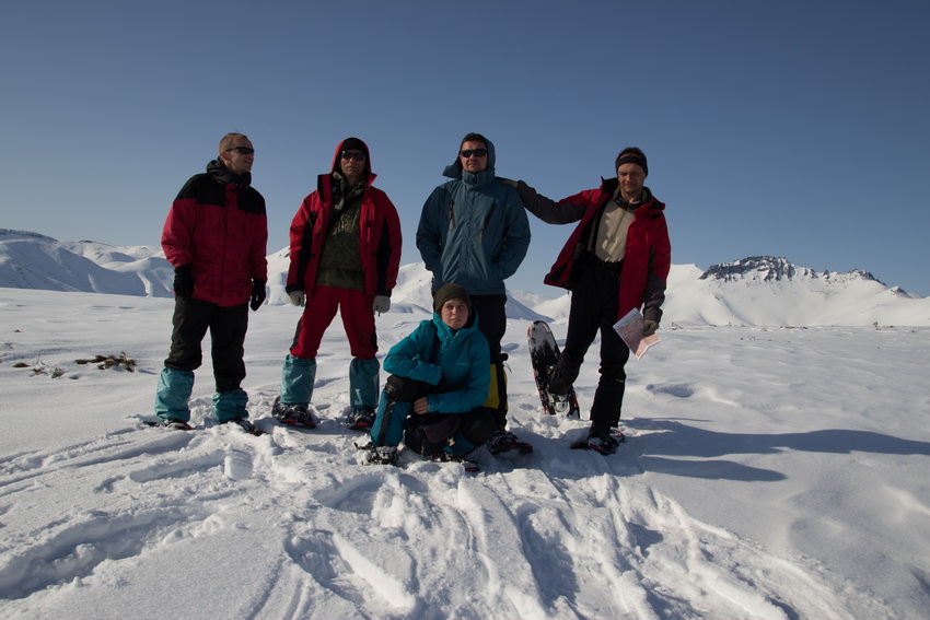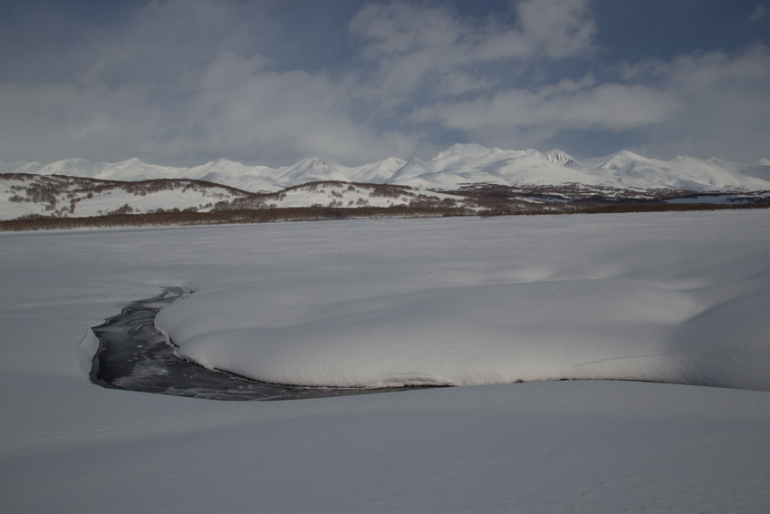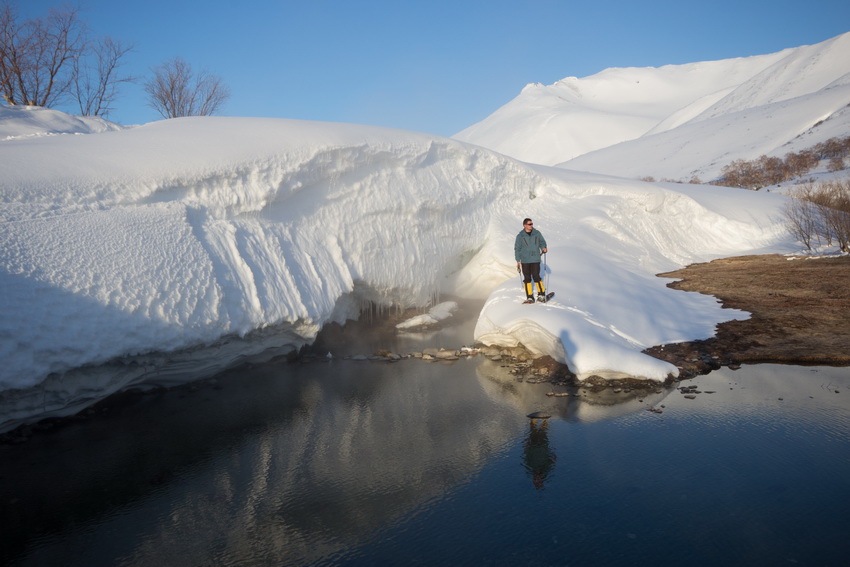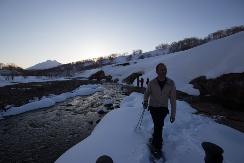 Путь наш – пологий траверсовый подъем ~5км по плотному снегу и заход через речку Вулканную, снегоступы нужны далеко не везде. В "кратере" течет кислый ручей