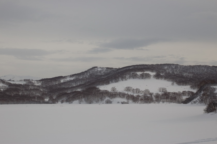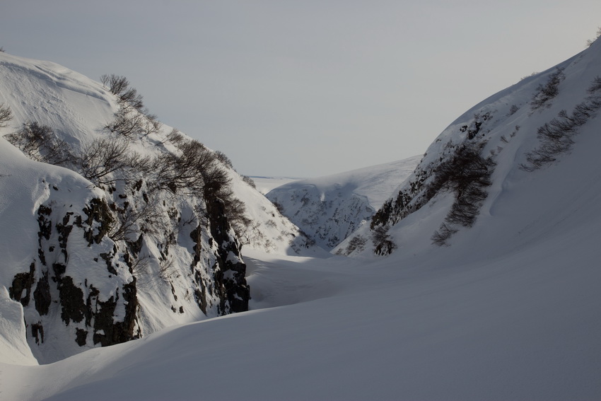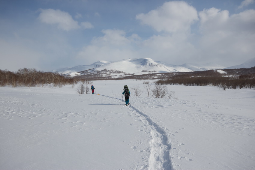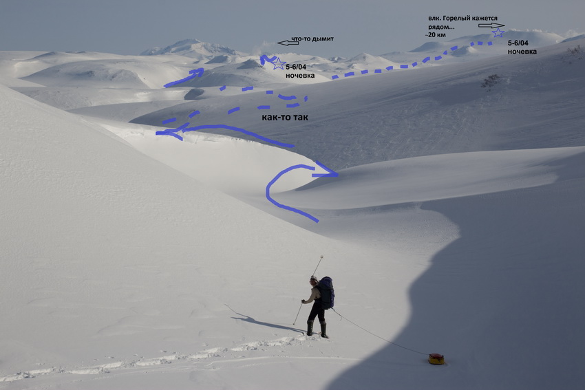 Встал ~7-00 и начал готовить завтрак. Вечером костер протаял метра на 3. Был заказ на зерновую кашу с молоком. Зерно перепутал с гречкой, а сухого молока вбухал (к ужасу Верочки) аж ½ банки. Это четверть всего запаса… Так что едим молочный гречневый супчик. Кстати -- ничего, со школы такого не ел. Кофе наполовину выкипел и получилось ~30 мл каждому. Говно. Утром шьем – я опять штаны, а Сереги (переругиваясь) – палатку. Селезнем зачем-то порвал ее ледорубом. Рабочая версия – отбивался ночью от Егорова. Штаны я шью не снимая и, в итоге, пришил к кальсонам… Много матерных слов. Идет снег, t~-6. Саша тоже матерится – пока он копал накануне пещеру, то весь вымок, а шмотка (особенно перчатки) осталась на улице и задубела. Вышли в 9-50.Идем по рыхлому ~30 см снегу, снегоходные следы ("буранка") местами переметена и не читается. Потом опять находится. Знакомая камчатская особенность – куда идти глобально понятно – благо есть и карта (1км) и GPS, но из-за "микрорельефа" локальное направление не очевидно. Иногда – солнце, иногда – снег.